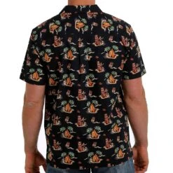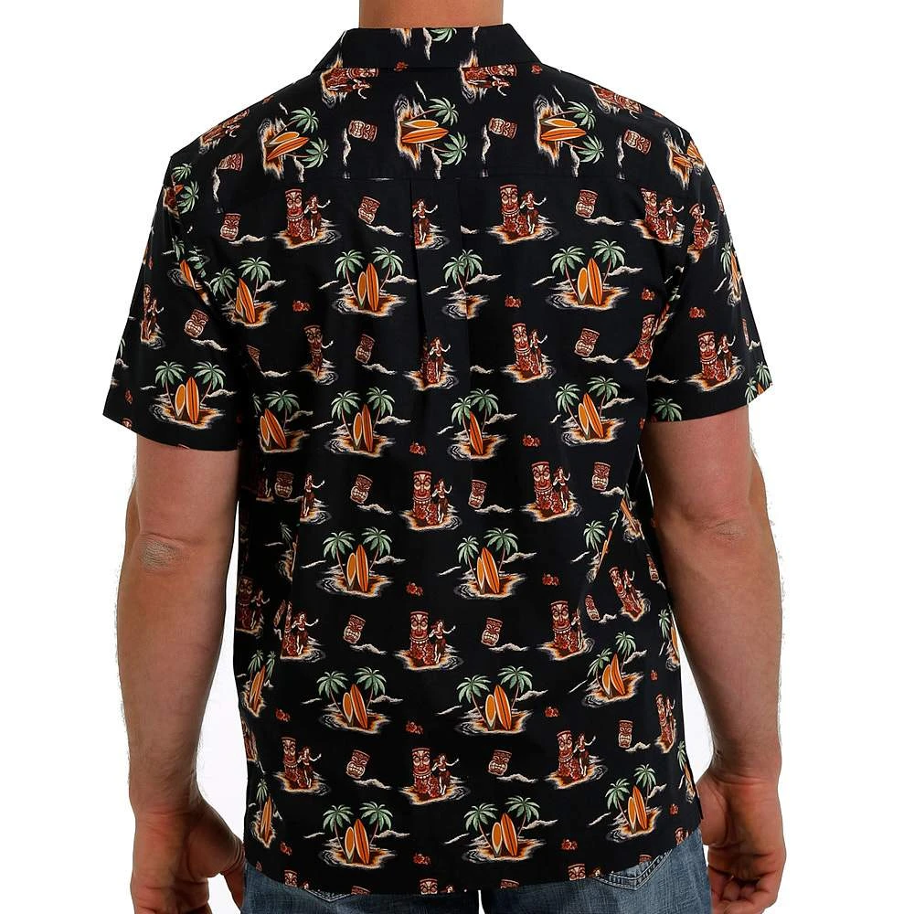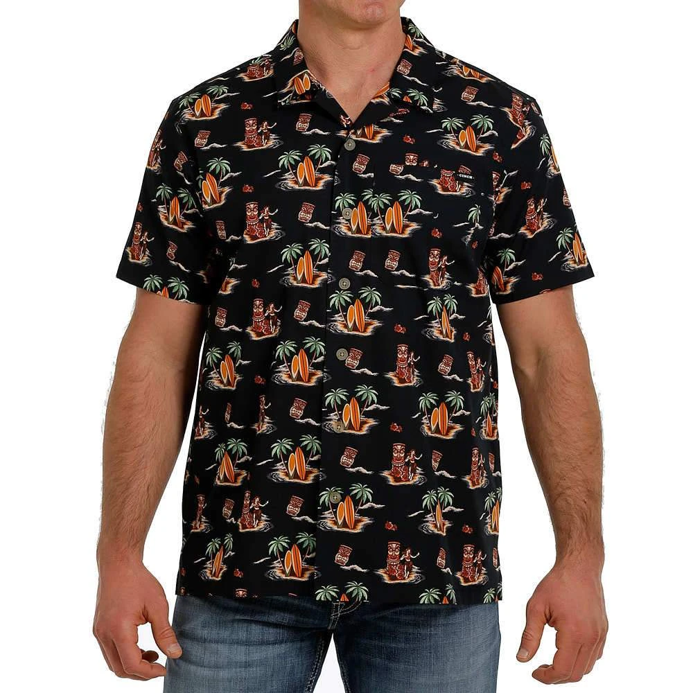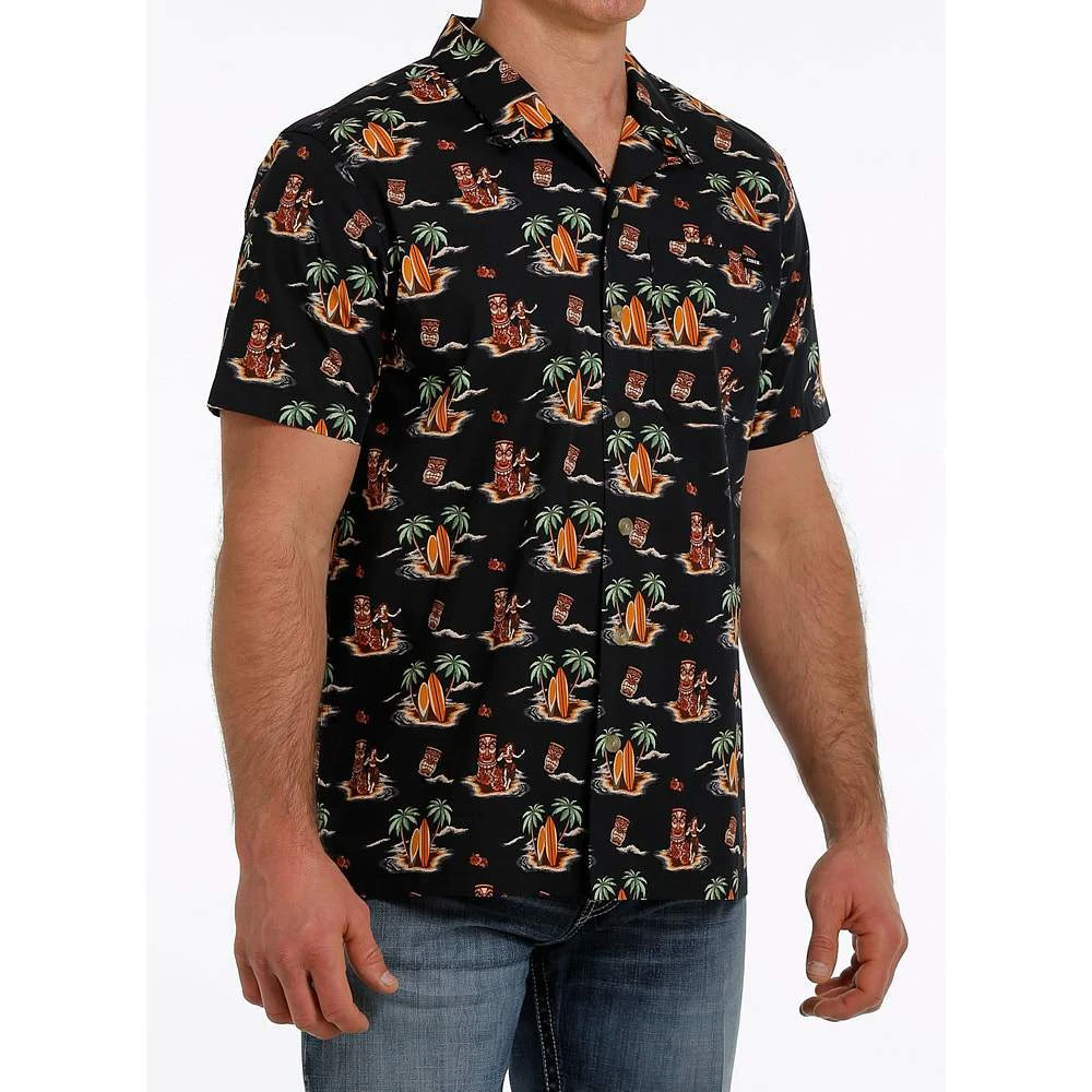 Step out in style wearing our black tiki printed Camp Aloha shirt by Cinch.