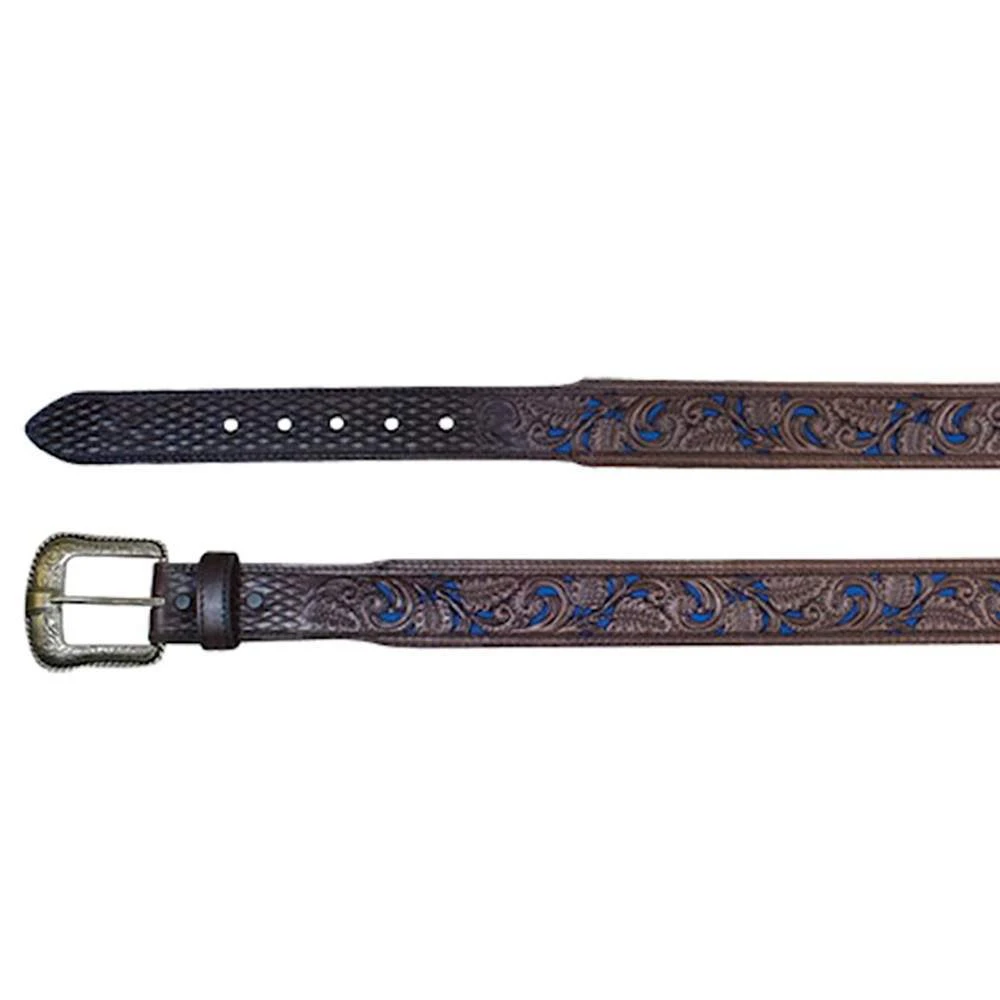 This JP West Men’s belt features tooling with blue inlay with removable custom JP West buckle.