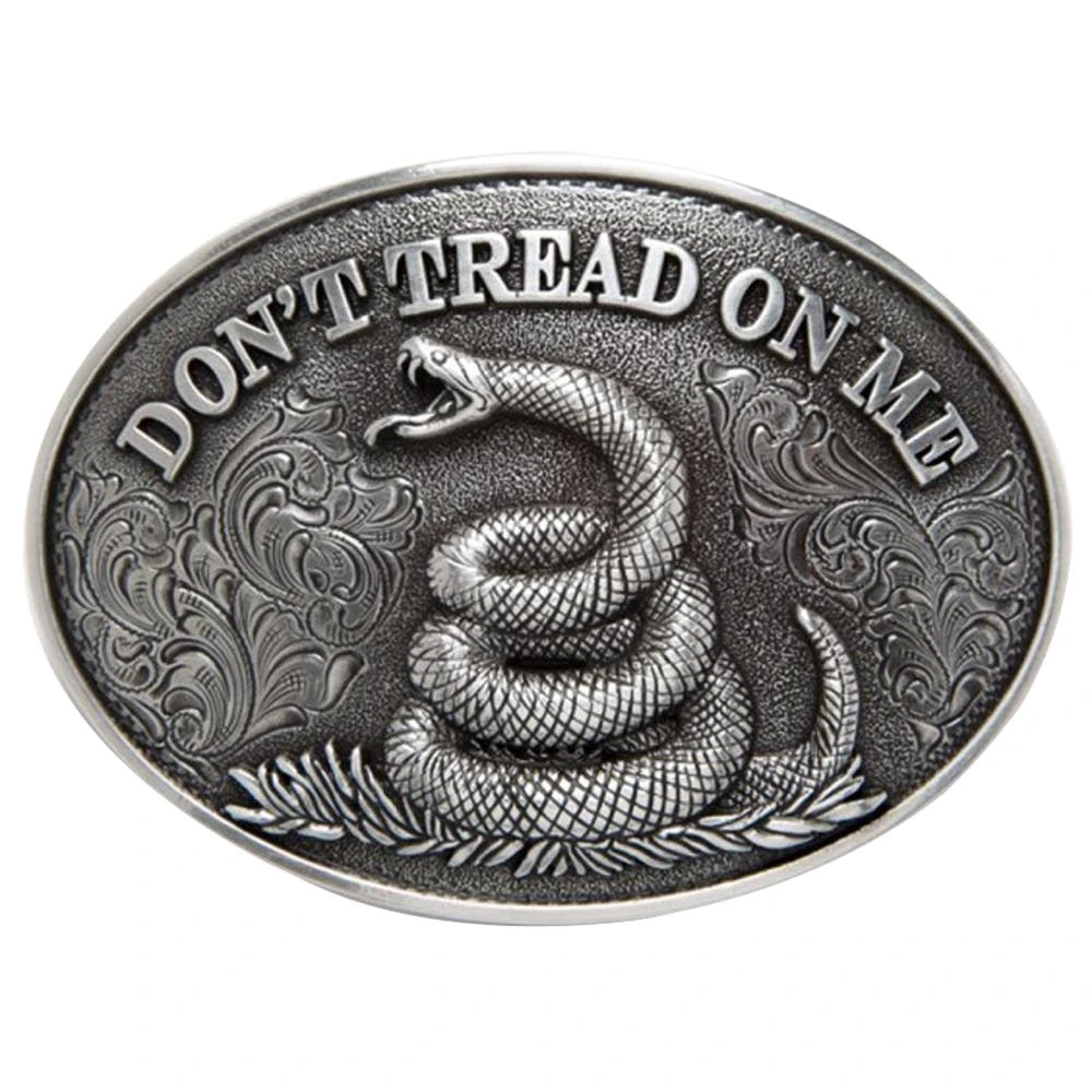 Oval shaped Nocona buckle by M&F Western Products® features a smooth edge with a snake and the words “Don’t Tread On Me” across the top. LASRP finish. Measures 3 ½” x 2 ½”.