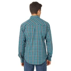 Serving that classic Wrangler® style at its best, this men’s long-sleeve fashion western snap plaid shirt comes with all the distinctive details you know and love. It features rancher’s crease styling in the front, a pointed front yoke, a sawtooth-inspired back yoke, two snap cuffs, double snap flap pockets at the chest, and a curved hem for versatility. It’s made of cotton to keep you comfortable all year long and it features a modern fit. You can leave it untucked or tuck it into your favorite Wrangler jeans, with a t-shirt underneath if you feel like layering.